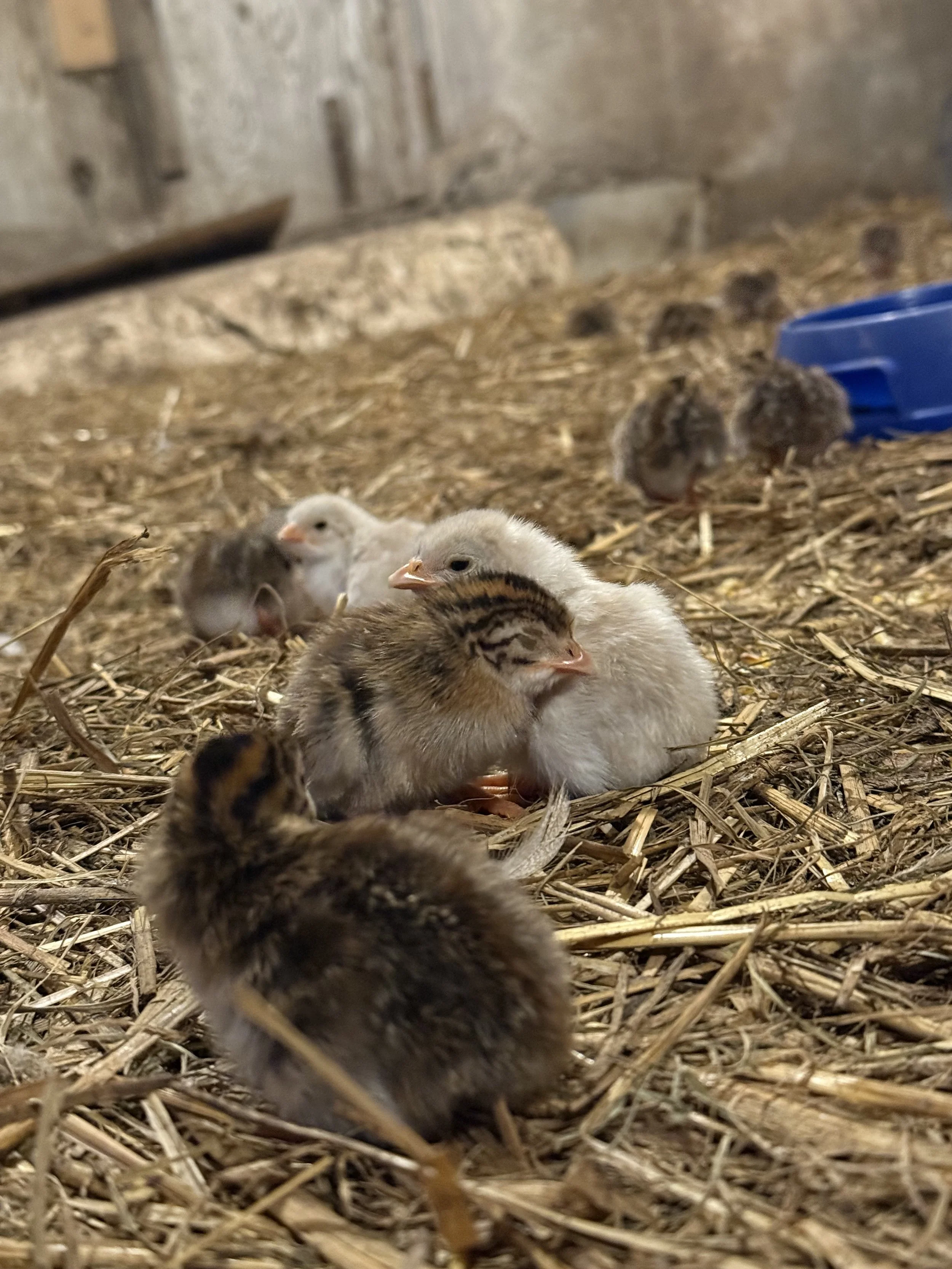 Nothing on the farm is quite as charming as the keets. Fresh out of the shell, they look like a cross between a chick and a chipmunk, with soft stripes down their backs and tiny legs that wobble as they find their balance. They huddle together for warmth, cheeping in little voices, and then dash off in bursts of energy that make them look like miniature wind-up toys.