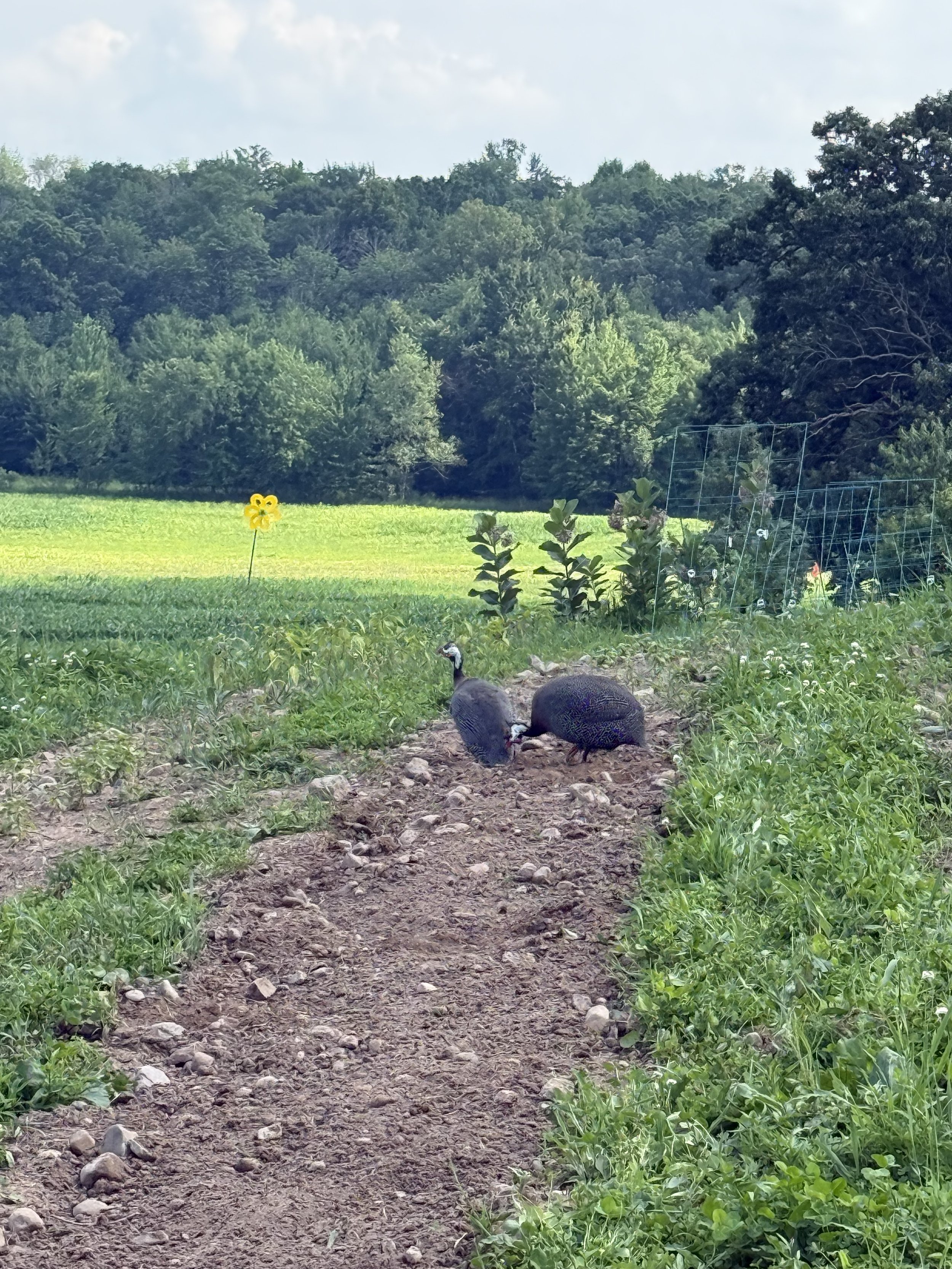Guinea fowl inspectors — checking out a fresh row I’m prepping to plant.