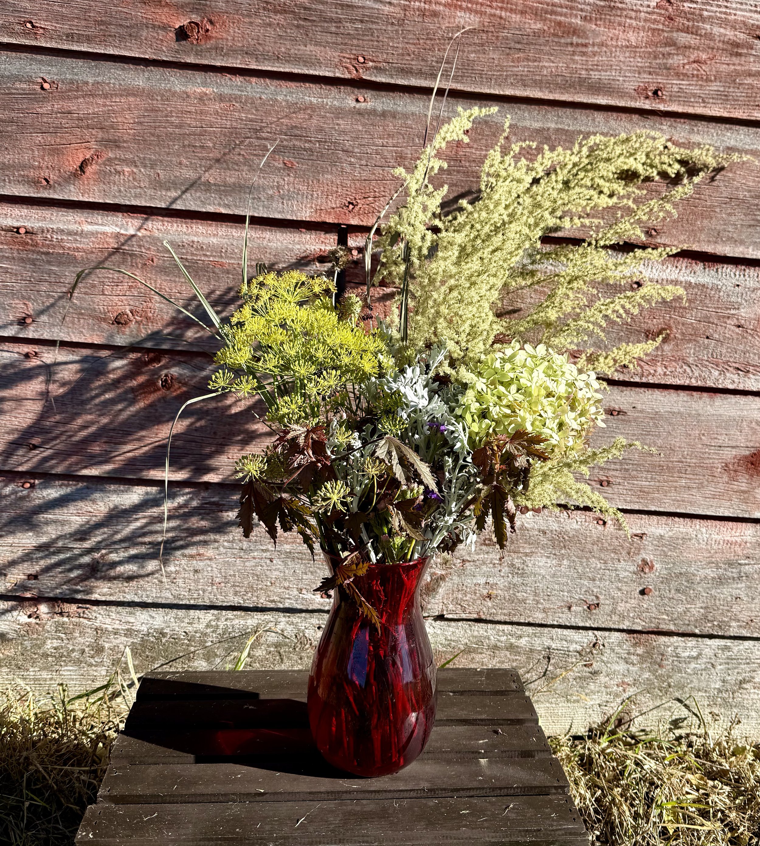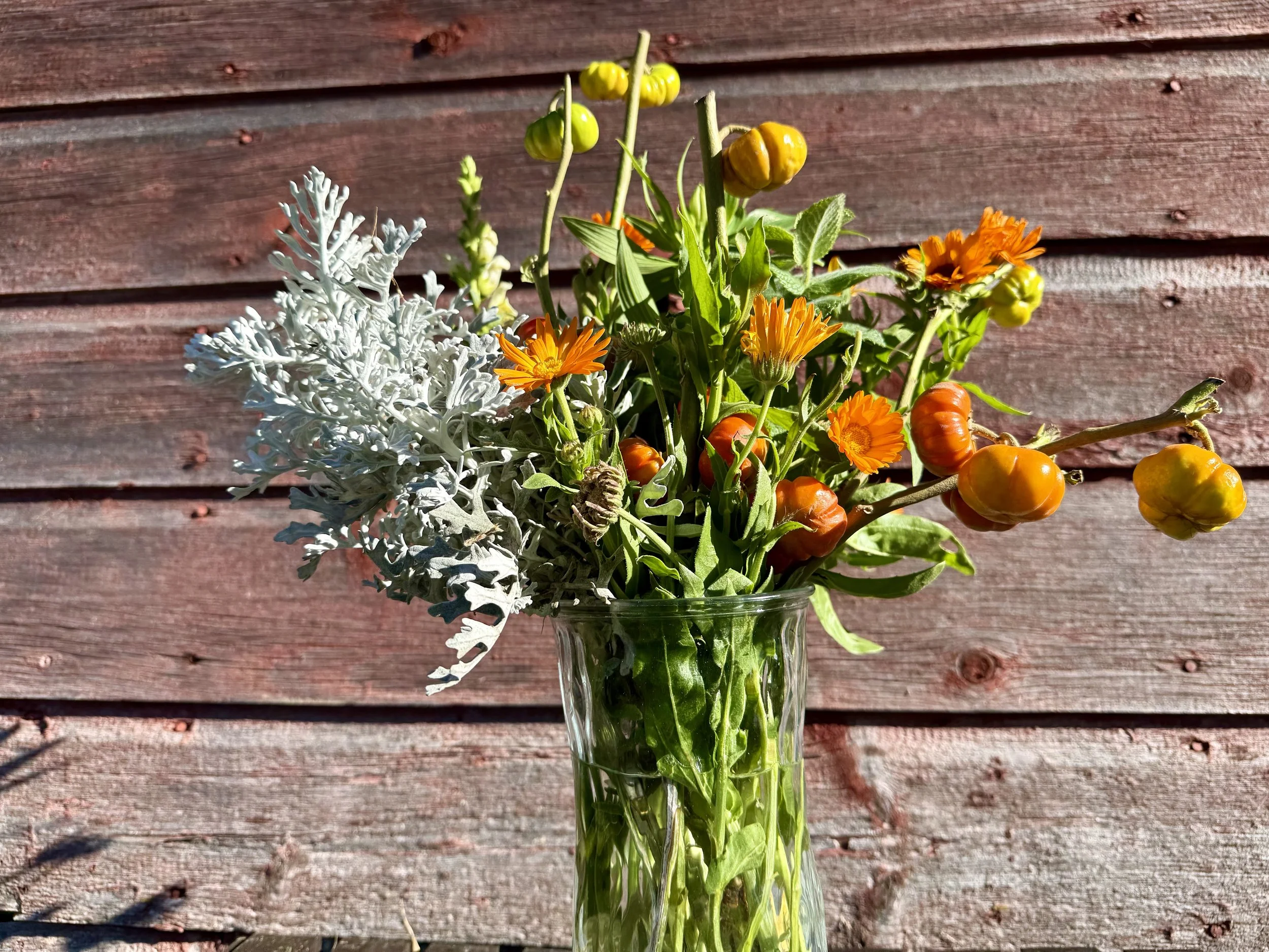 The bright red peppers have been another fun addition — they really make a bouquet pop. It can be surprisingly practical to pick them green before a frost and let them ripen in a vase of fresh water indoors. They hold their shape well and bring that lively late-season warmth to the mix.