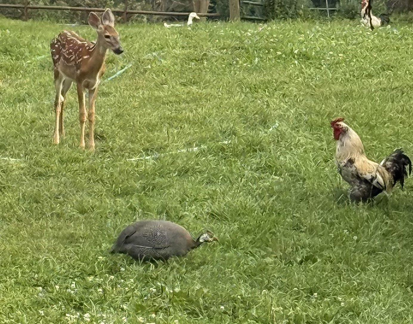 Farm pals: a curious fawn, our roosters, a duck, and a guinea hanging out like they own the place.
